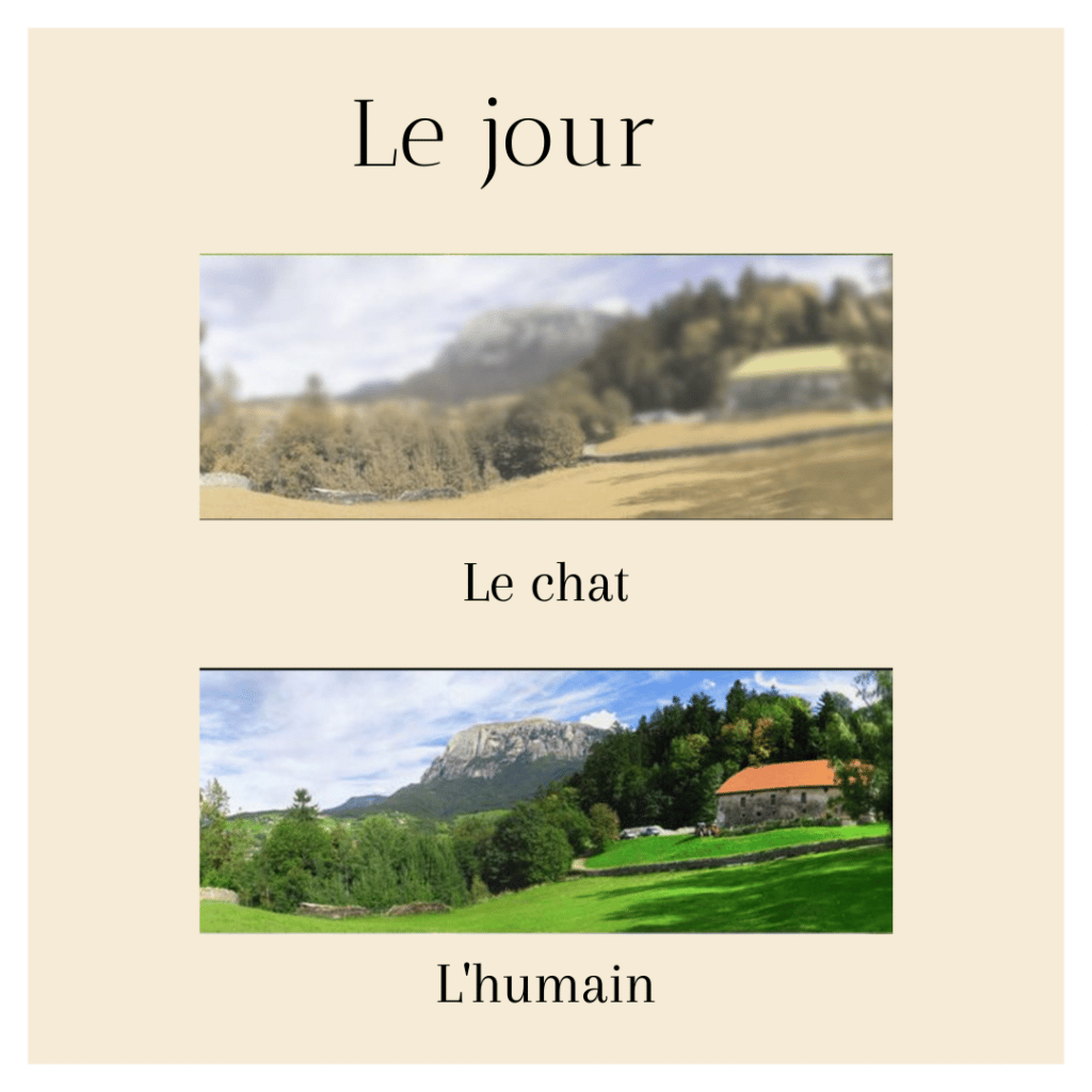 Le chat fonctionne avec un systĂšme dichromatique (deux couleurs de base) alors que nous, nous fonctionnons avec un systĂšme trichromatique (trois couleurs de base). Nous pouvons dire quâil est daltonien.